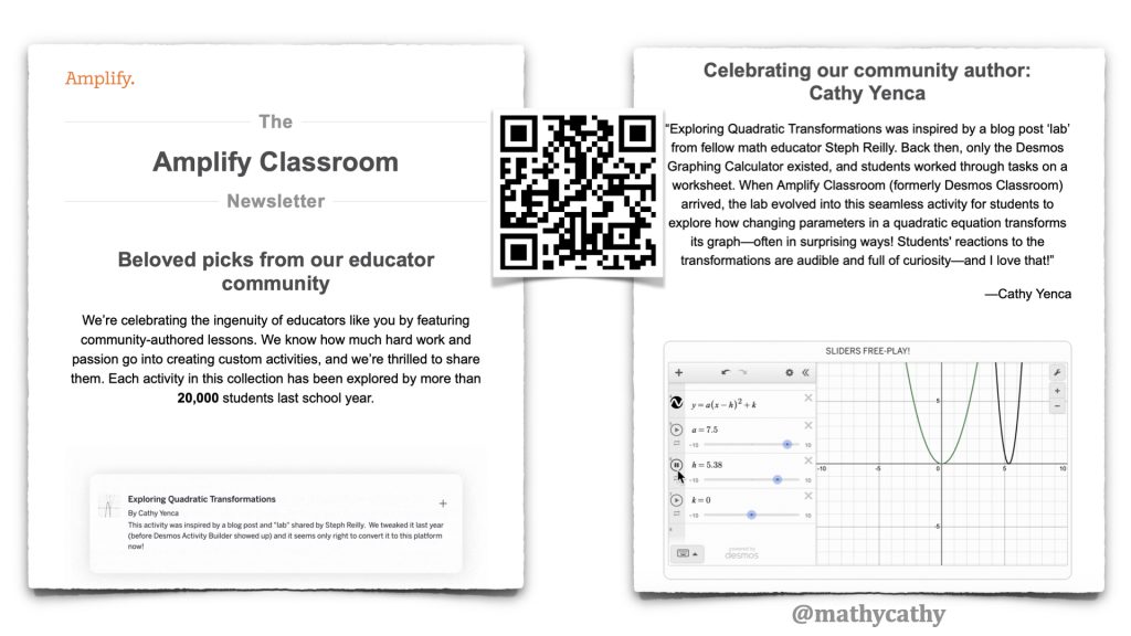 First of all, I am SO GRATEFUL that the changes that have been happening over the course of the last several years with Desmos Classroom / Amplify Classroom have not impacted our access to the free resources we’ve been creating and sharing and REFINING for a literal DECADE. We’ve come to rely on these teacher-created resources to enhance student learning, designing math journeys that only years of classroom experience can inspire. Those in the trenches creating and sharing resources? POWERFUL.