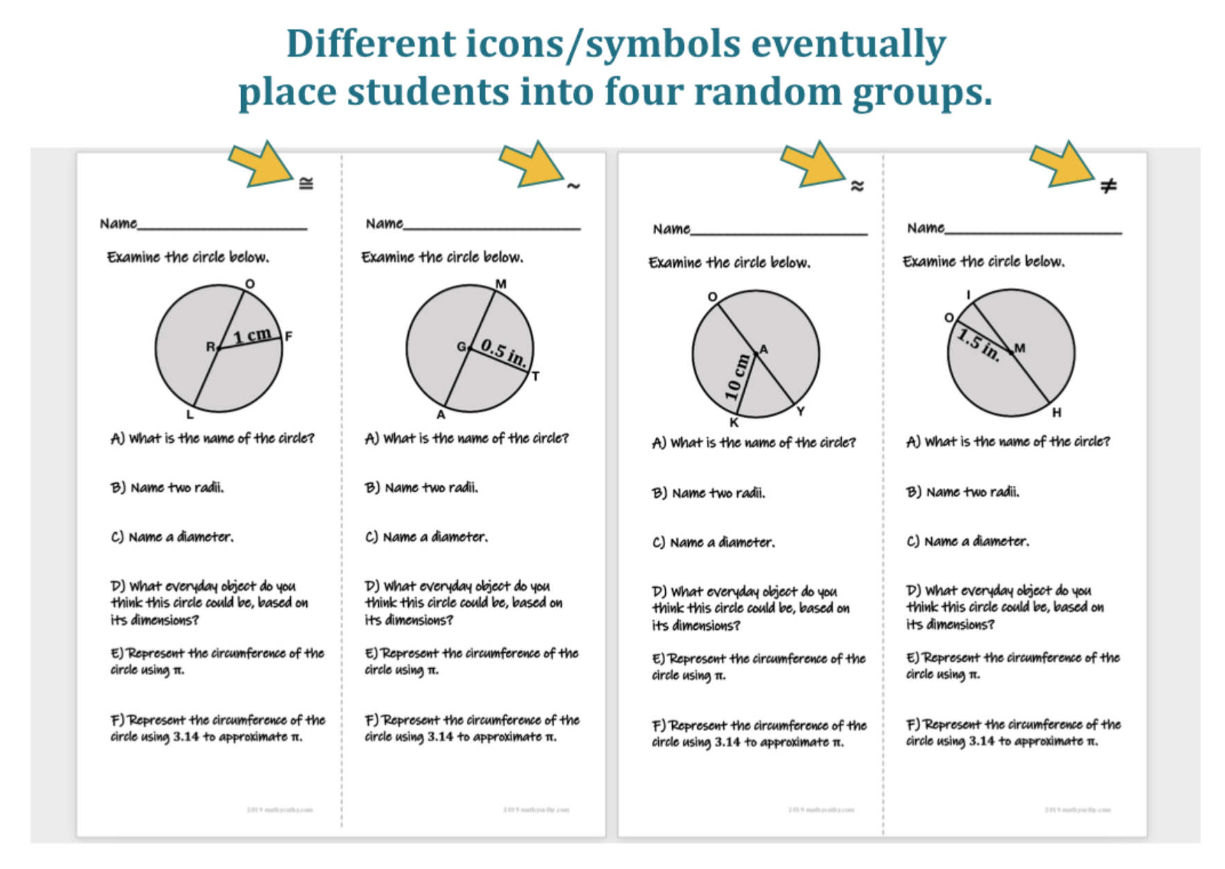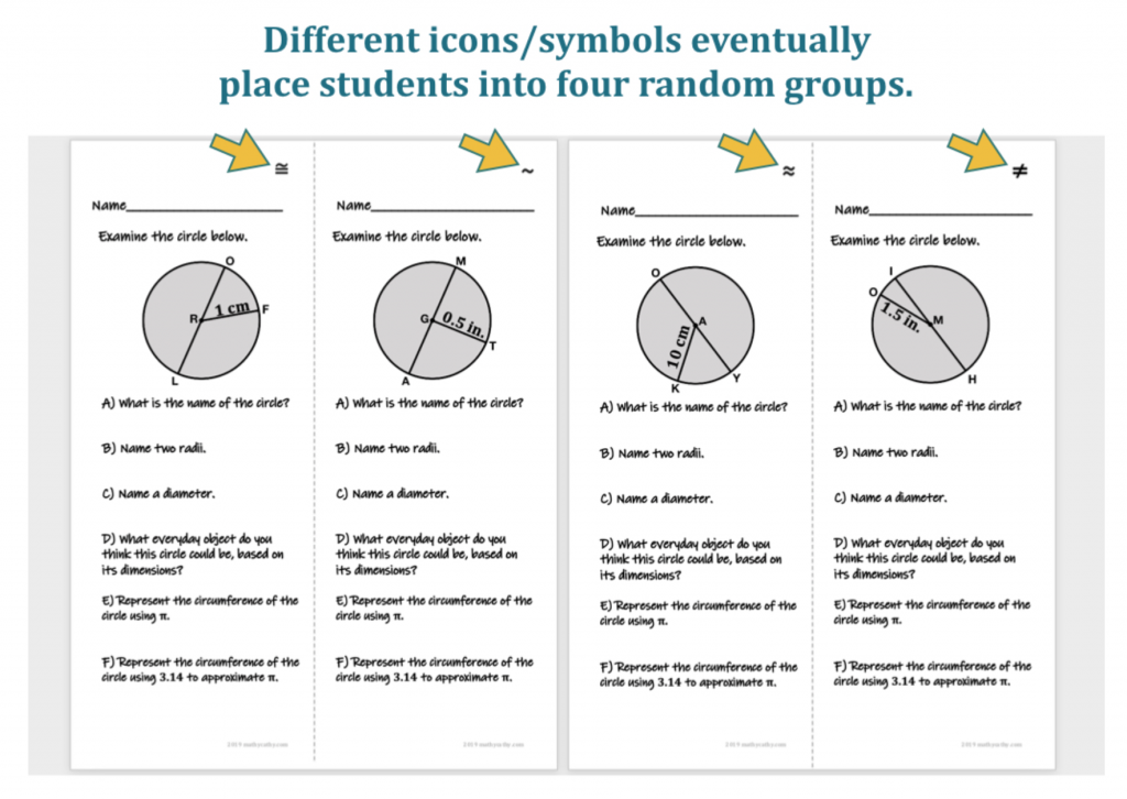 Using 4 different sets of similar problems, students FIRST work individually on their own brief set of problems. Students may not realize that there are 4 different versions of the problems floating around the classroom just yet! Then, after a few minutes of independent work, I send students to each of the 4 corners of the classroom (or 4 specific areas I’d like them to meet) according to the emoji pictured in the top corner of each warm-up sheet. These randomly-grouped students compare and discuss solutions with one another, making corrections as needed. I check in with each group, and we come back together as a class to discuss solution strategies and questions. Meeting with a random small group seems more to students’ liking than being asked to talk to a peer one-on-one.